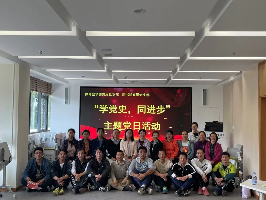 2021年5月11日上午8:30,在图书馆四层日新讲堂,由图书馆直属党支部书记邓亚文和体育教学部直属党支部书记王伟光的主持开展了"学党史,同进步"主题党日活动。