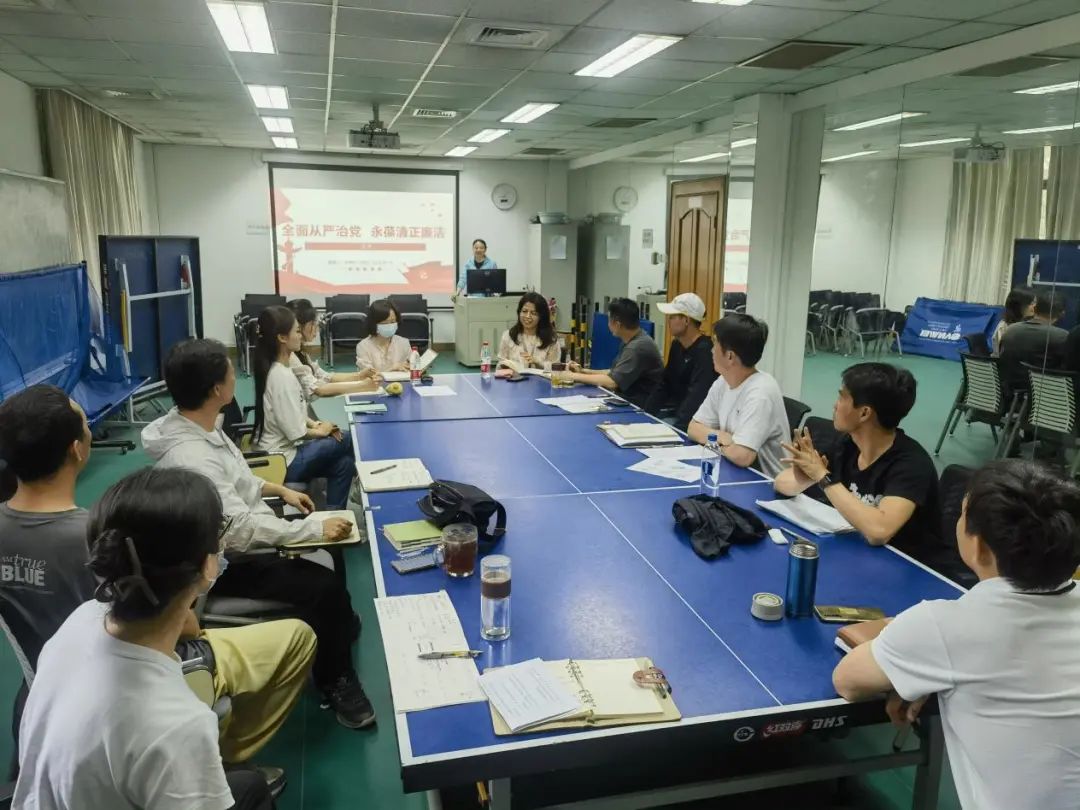 2023年5月16日,体育教学部直属党支部书记王伟光老师在体育馆218教室组织开展主题为“全面从严治党,永葆清正廉洁”的党课学习活动。党委教师工作部副部长张坤,党委研工部副部长、研究生院副院长刘洁列席,体育教学部所有老师参加。
