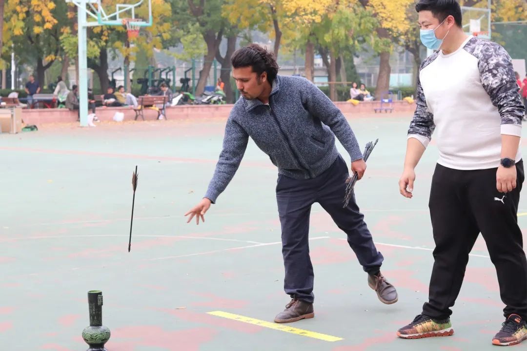 参赛同学站在距离壶 1m 远的投掷线处,拿着一根箭向壶里投掷,一共有十次投掷机会,投进壶口中算两分,壶口耳孔计一分。