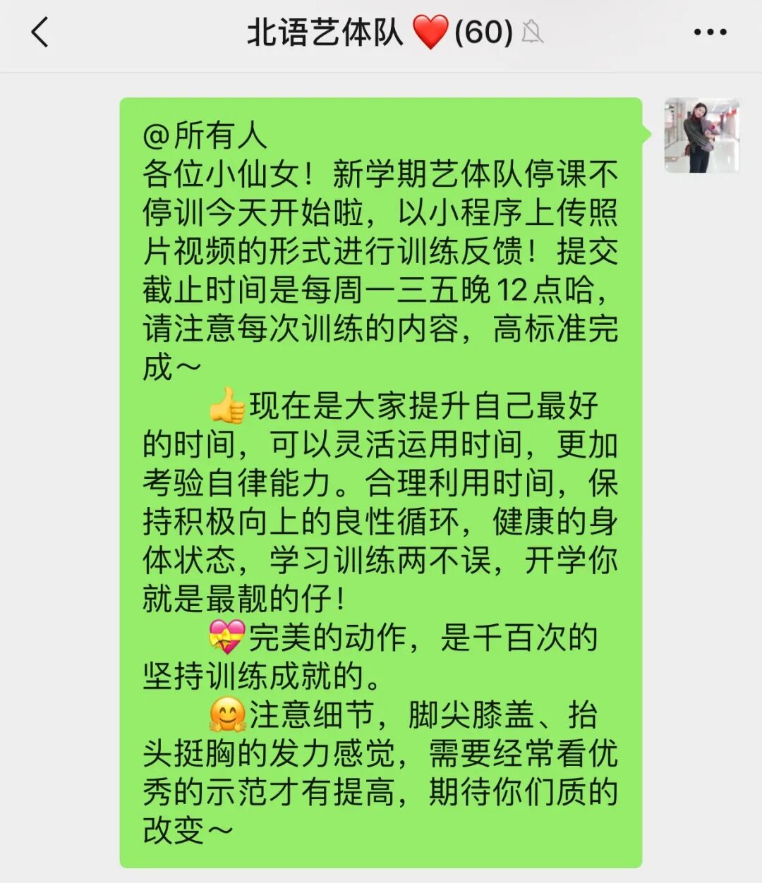 全国赛事可谓是每个艺体姑娘心中的最为神圣和崇高的目标,日复一日、年复一年的训练只为在赛场上展现精彩完美的优雅动作。今年,受疫情的影响,无法进行现场赛事,转为进行线上赛事(2020年全国大学生健康活力“云”系列大赛艺术体操项目),但这丝毫抹灭不了艺体人的热情和动力。上半年虽然只能居家练习,艺体队的小仙女们按照老师的安排井然有序地开展自我训练,保持身体柔韧性和其他基本素质,努力提高技术水平。春去秋来,花开花落,唯一不变的是那一遍遍重复练习的曼妙姿态、一次次绷紧脚背的坚定信念和一双双渴望实现梦想的双眸。自收到比赛确切消息以来,北语艺体队厉兵秣马,积极投入到比赛集训中,并制定了相应的训练计划,每个人都在训练场上挥洒着属于自己青春的汗水,诠释着对艺体的执着与热爱。