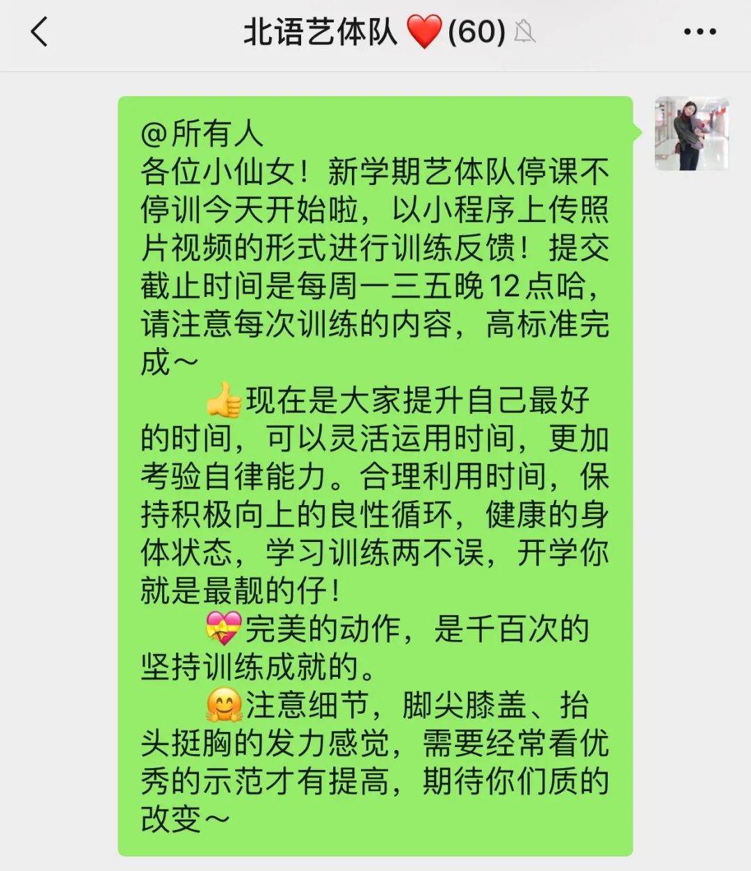 受新冠疫情的影响,上半年艺体队无法像往常一样开展日常训练,但有艺体人的地方就阻挡不了训练的斗志!艺体队的小仙女们面对只能居家练习的情况也不放松不懈怠,每周都按照老师们的安排按时上传训练视频,基本功、力量训练、体能训练都不落下,力争保持良好的身体状态为下半年的比赛做准备。