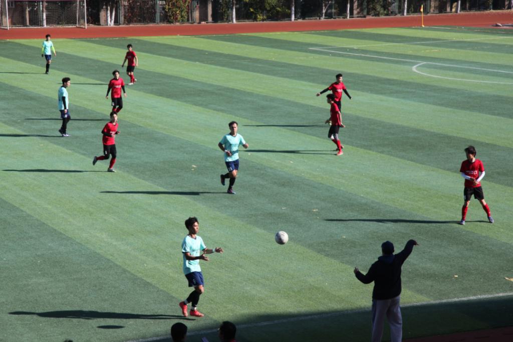 在抵挡住对手开局猛烈的攻势之后,我校男足吹响了反击的号角。左边前卫6号李孟达的速度和右边前卫9号李树强过硬的个人技术,都给对方的边后卫造成了极大的威胁。三位中场核心队员在不断尝试进攻的同时,也通过牢固的防守屡屡化解对方的攻势。