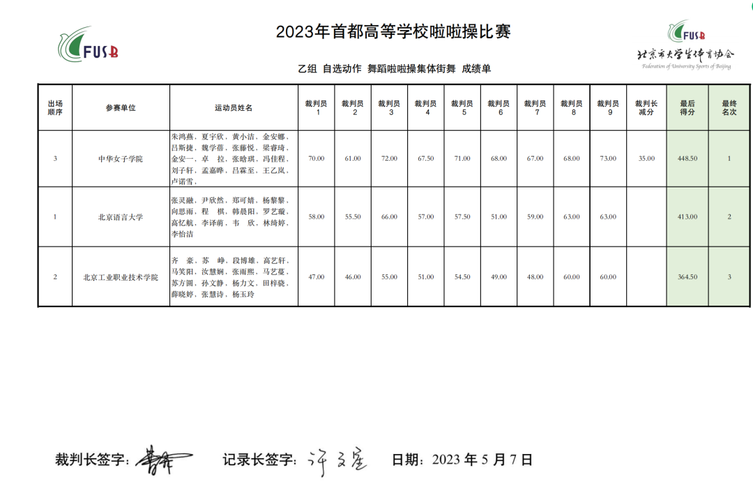 2023年5月7日,首都高等学校啦啦操比赛在首钢会展中心拉开帷幕,北语舞蹈啦啦操队在本次比赛中通过不懈努力,荣获乙组街舞自选大集体第二名!
