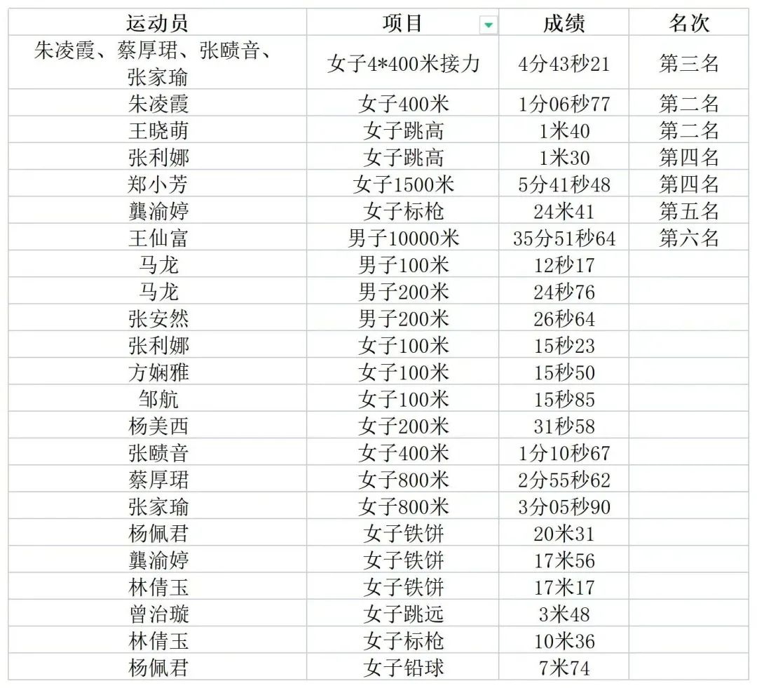在本次女子1500米决赛中,我校的郑小芳同学以5分41秒48的成绩取得了第四名,让我们用热烈的掌声恭喜她,希望再接再厉,期待下次取得更骄人的成绩!