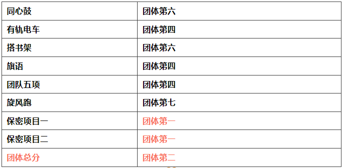 通过最后的两项保密项目,全力一搏,力挽狂澜,连续夺取两个项目冠军,直接将团体总分拉到团体第二名,大获全胜,凯旋而归。