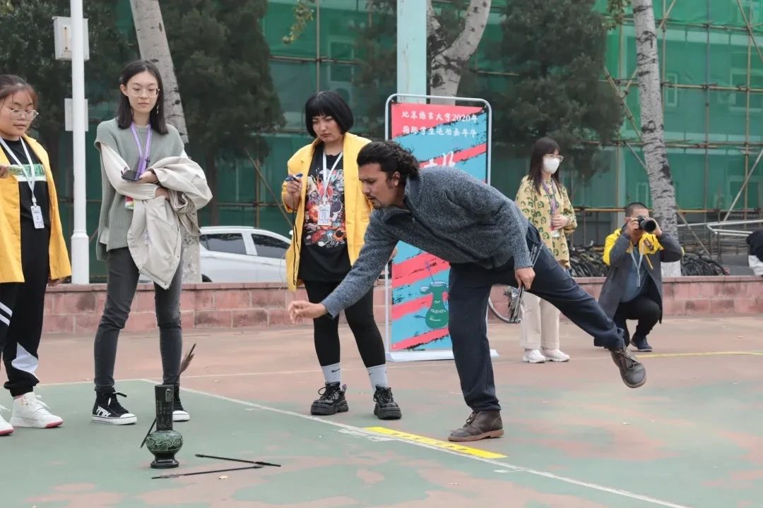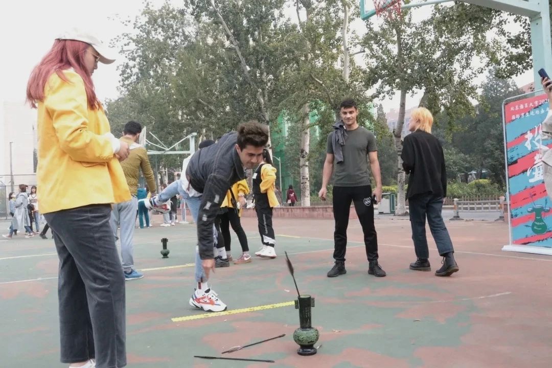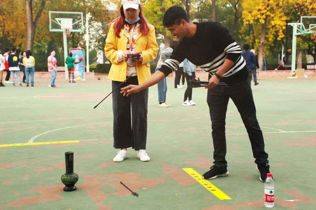 参赛同学站在距离壶 1m 远的投掷线处,拿着一根箭向壶里投掷,一共有十次投掷机会,投进壶口中算两分,壶口耳孔计一分。