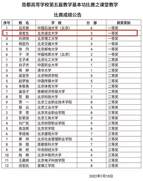 2022年7月10日,由北京市教育委员会主办,北京市大学生体育协会、北京交通大学体育部承办的首都高等学校第五届体育教师教学基本功比赛决赛在北京交通大学体育馆举办,我校体育教学部游发生老师在决赛中表现优异,以总分第二名的成绩荣获此次比赛一等奖。