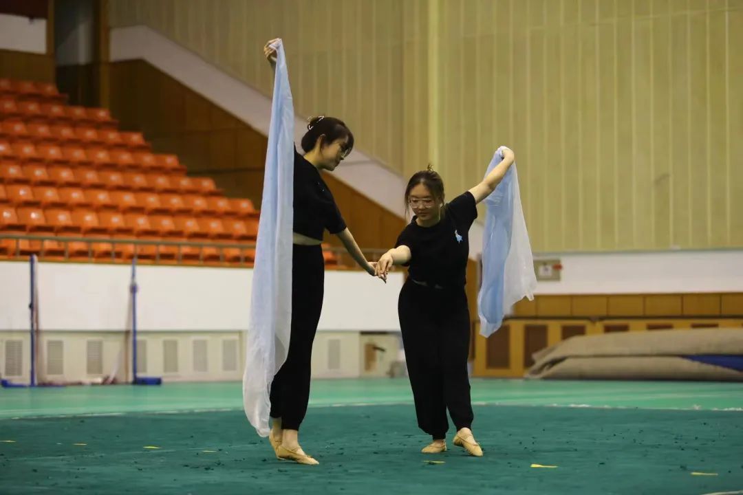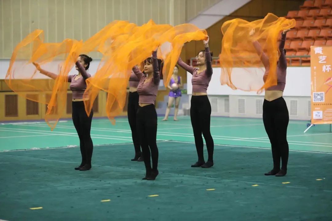 在现场雷鸣不息的掌声中,常规赛暂时告一段落,迎来了第二项,有趣新奇的“趣味赛”。趣味赛分为:趣味纱巾和趣味圈球绳,来自不同院系不同专业的六位同学组成三个小组,为大家带来了含有纱巾元素的美丽舞蹈。