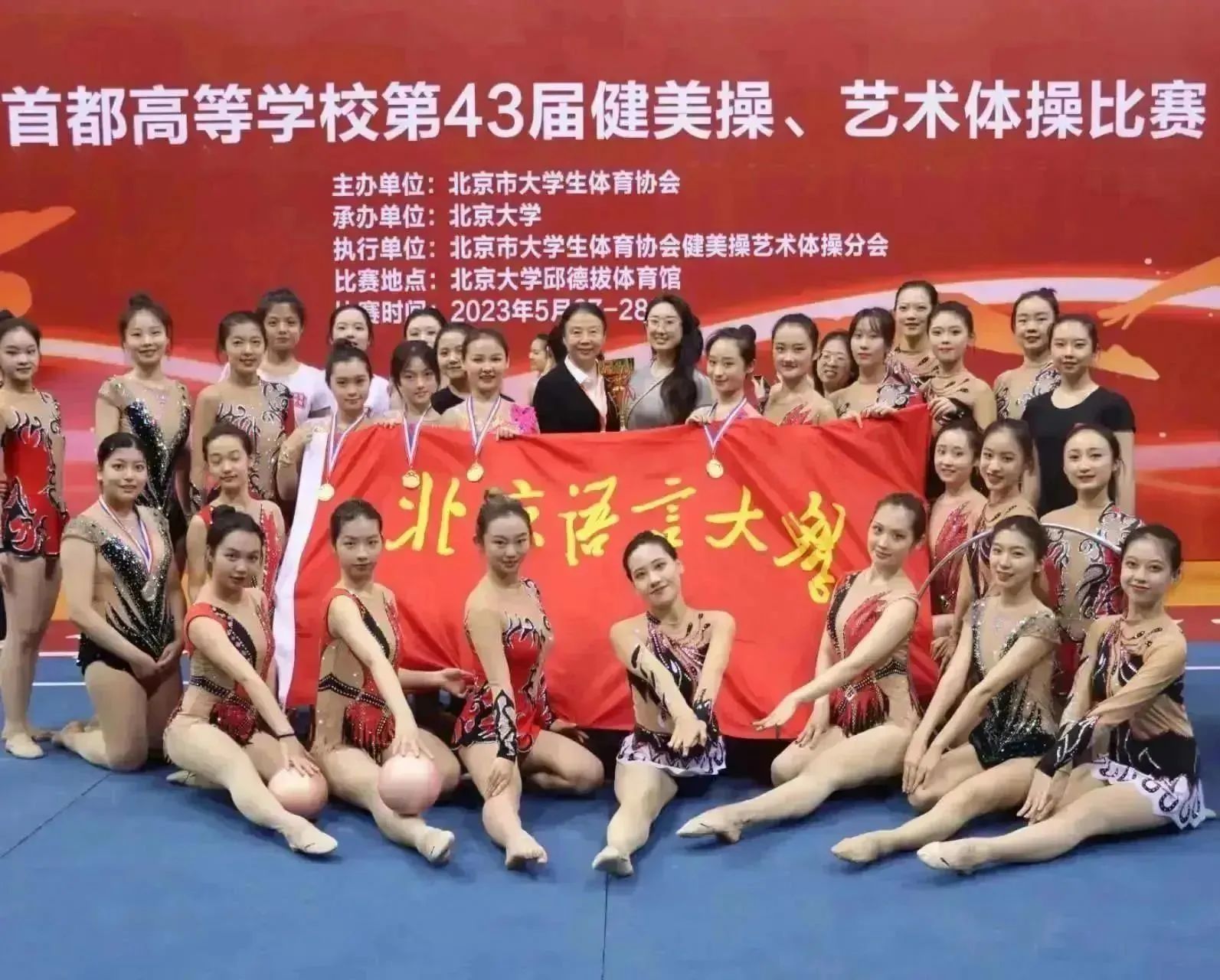 首都高等学校第43届健美操、艺术体操比赛圆满落幕,感谢老师的耐心指导与陪伴,同时也感谢队员们的团结奋斗,再次祝贺北京语言大学艺体队在比赛中取得优异的成绩!
