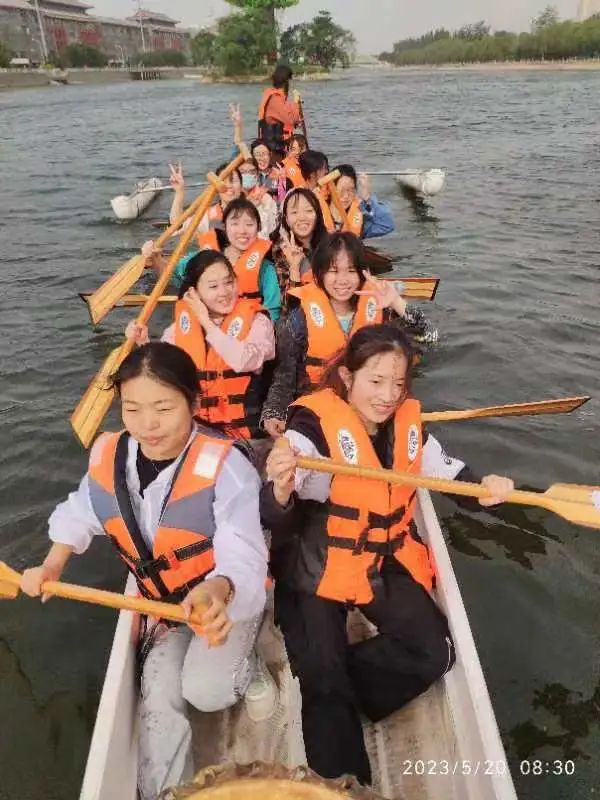 受现实条件限制,龙舟队队员初期在游泳馆进行训练,训练时,龙舟桨手队员单膝跪在池边,探出半身,在鼓手打点节奏下于游泳池中划动木桨,舵手模拟掌舵。游泳馆中的训练训练了队员们的耐力和力量,提高了每位队员的划桨贡献力,同时增进了队员间的合作能力。同时,在老师带队下,队员们也多次前往高碑店水库进行实地练习,亲自登上龙舟,训练效果无疑事半功倍,队员们熟悉了真正划龙舟的手感,同时训练效果和合作效果也更上一层。尤其是对于舵手来说,登上龙舟的实地的训练使舵手更加熟稔船舵的使用方法,反复多次的折返转弯,靠岸出岸更使舵手转向,控制龙舟的能力得到了大大提升。