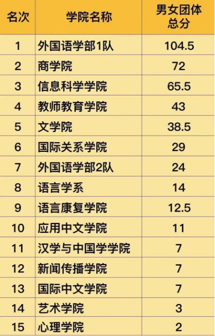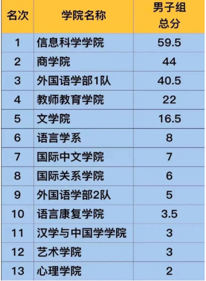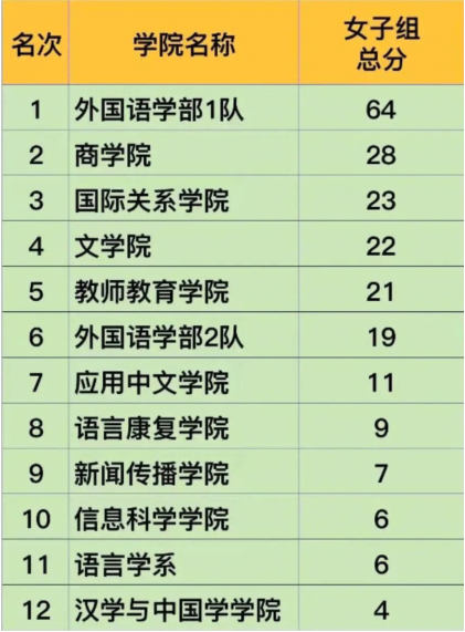 各院系团体总分、男子总分、女子总分、各项目前6名成绩如下