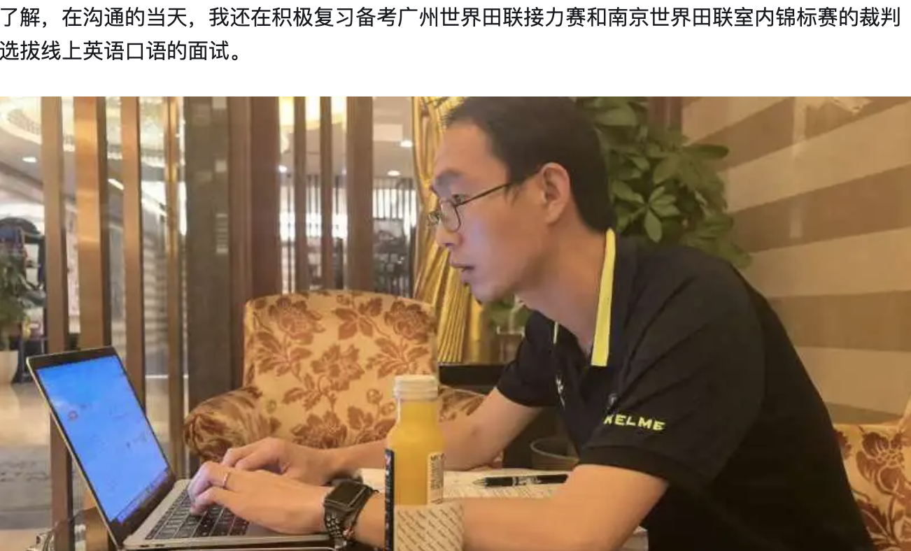 8月19日返京的高铁上,张老师收到了2025南京世界田联室内锦标赛国内裁判员选拔的通知,他报名参与选拔并在9月初完成了线上的考试和面试。
