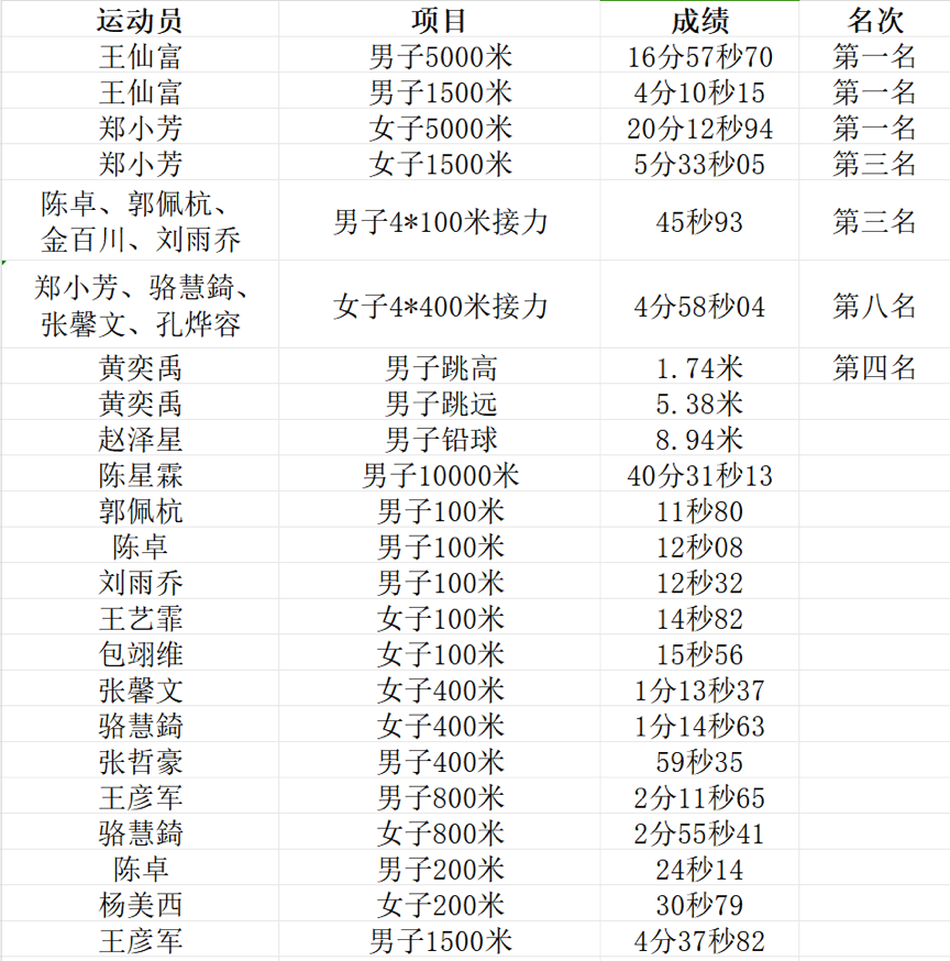 高级翻译学院2022级黄奕禹,虽然是第一次参加比赛,但他依旧沉着冷静,超水平发挥,在比赛中跳出1.74的好成绩,夺得第四名。外国语学部东方语言文化学院2022级郑小芳、外国语学部英语学院2022级骆慧錡、文学院2023级张馨文、外国语学部英语学院2023孔烨容以4分58秒04的成绩获得4*400米第八名。此外,还有很多运动员努力拼搏,虽然他们的成绩暂时没有进入北京市高校比赛的前八名,但他们努力拼搏、不言放弃的精神和意志品质,仍然值得我们学习。以下是本次运动会所有运动员姓名、项目、成绩及名次。