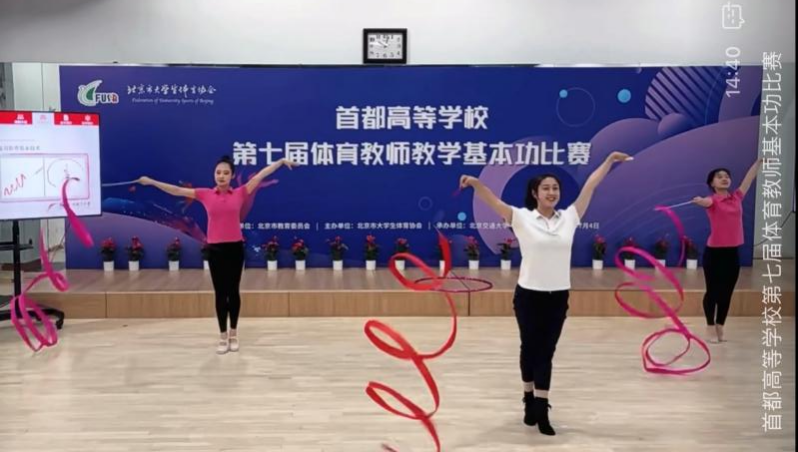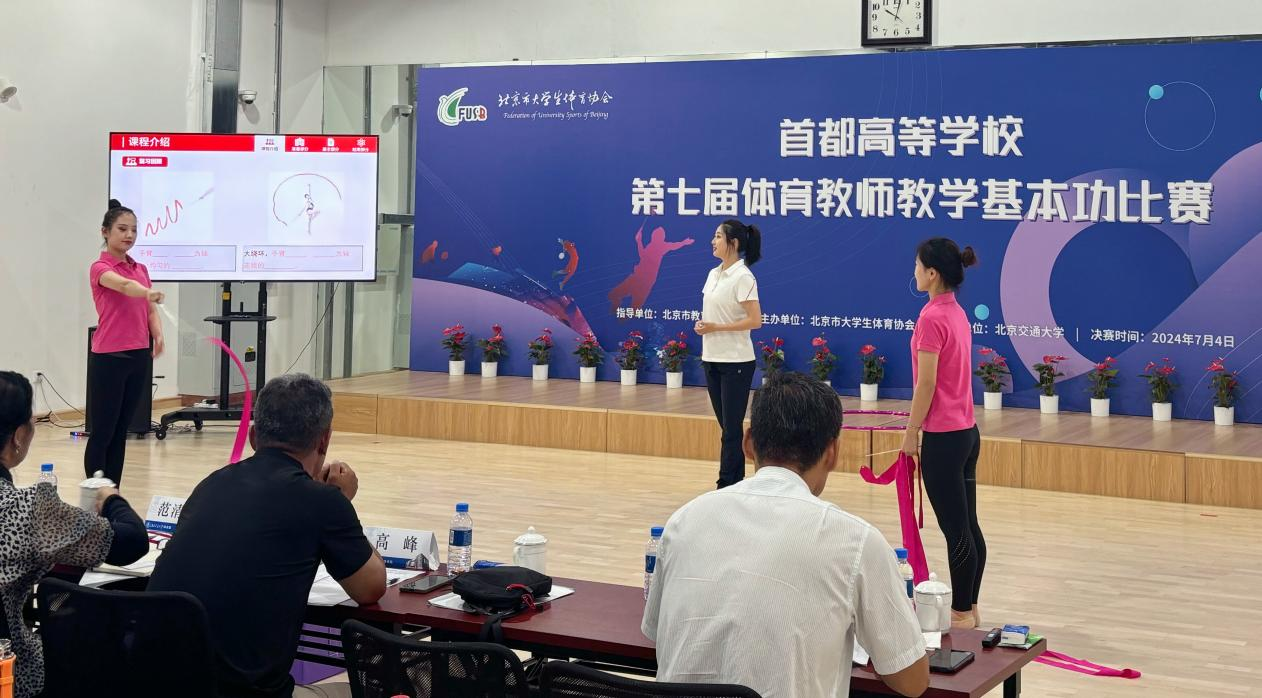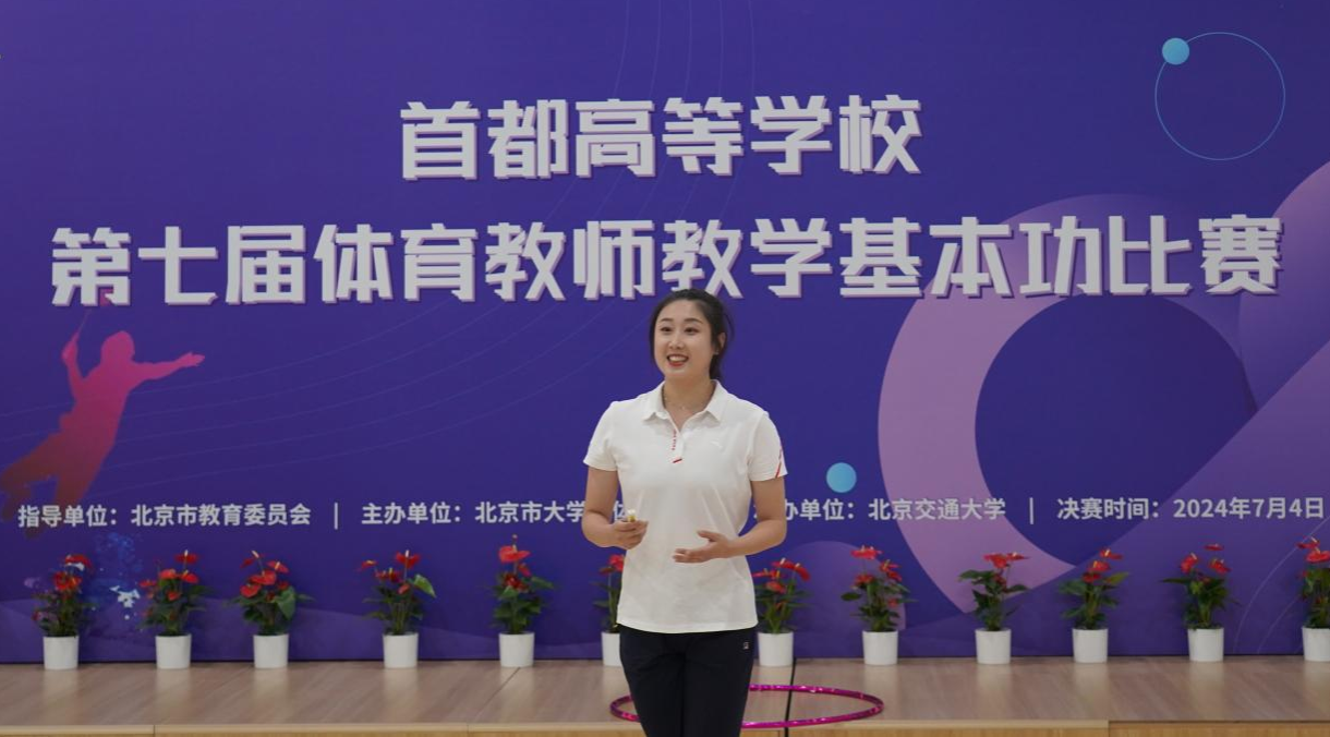 2024年7月4日,由北京市教育委员会指导、北京市大学生体育协会主办的首都高校第七届体育教师教学基本功比赛在北京交通大学综合体育馆胜利举行。我校体育教学部教师刘颖以预赛第一的成绩进入决赛,并在决赛中取得了一等奖的优异成绩。