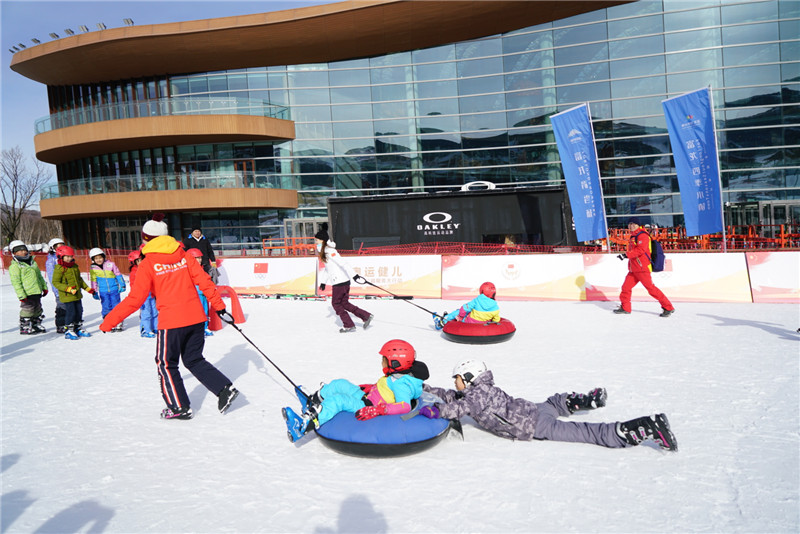 虽然下花园区距离滑雪胜地崇礼区不远,但参加这次雪上培训的200多名小学生却大多是第一次来到雪场,滑雪技术处于零基础。根据这个情况,两位滑雪教练程爽和杨雨因材施教,不急于让孩子们过早接触滑雪技术,而是从培养孩子们对滑雪的兴趣和提高雪感入手,活动第一天的上午组织孩子们玩起了雪上小游戏。第一个游戏是雪上竞速接龙,孩子们被分为两个小组,依次排成长队,两位教练各自带领一组进行比赛,每个孩子在出发前先绕着滑雪手杖转五圈,然后起跑出发,自终点返回后把手杖交给下一位同学,直到每个孩子都跑完计算整个队伍的用时判断胜负。在这个游戏环节中,程爽带领的队伍先拔头筹。第二个游戏中,比赛道具由滑雪手杖换成了雪地轮胎,一位同学坐在轮胎中间,一位同学在前面拉,另一位同学在后面推,比较讲究配合。这个环节中,杨雨提醒大家,体重轻一点的同学坐在轮胎里,个子大的同学负责拉,个子小的负责推,这招果然奏效,杨雨队一路领先完成了比赛,把游戏比分扳平。